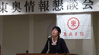 今日6月15日は「東奥情報懇談会」でした。講師は淑徳大客員教授の深澤真紀氏。“草食男子”という言葉の生みの親であり、“TVタックル”“とくダネ!”などのコメンテーターとしても知られています。TVどおりに「独特」です。「毒舌」です。でも、それが面白い。温泉場でタオルをブンブン振り回しながらゆる~い会話を交わしているつもりが、それが急に的を射た話しになってビックリ!…という感じ。つまり油断して話しを聞いているとハッとして湯壺に落ちるよと。そのウィットに富んだ語り口は、流石に売れっ子コメンテーターだなぁと感心した90分でした