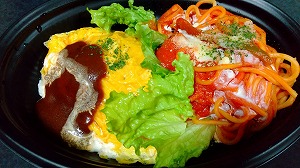 イトーヨーカドーの“half&half弁当(530円)”です。何のことはないナポリタンとオムライスが半分づつ入っています。お味も半分?いえいえ美味しいです!