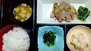 お婆ちゃんのお弁当です。メニュー表が来るので好きな献立の時だけとっています。今日は“豚肉のねぎだれかけ・ポテトサラダ・山東菜の磯辺和え”。一食600円。美味しいと言っています。お弁当の日は私も少しは楽できるかな…。