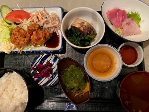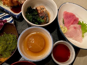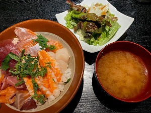 新町通りにある“居酒屋 月あかり”。気になっていたランチ「海鮮丼1,000円」マグロにサーモン、ホタテに蒸し海老。サラダにみそ汁。もう満腹です。個室がたくさんあるので、コロナ禍の今、安心して食べられるお店でした。