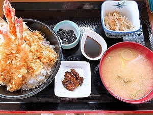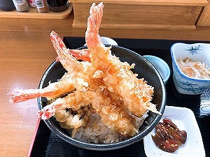 大間のスタッフさんに会いに向かう途中の「ばんやめし」。天丼を注文しましたが売切れの為(海老天丼¥1150)。お口いっぱいになる大きなエビが5本!茄子の天ぷらも入っています。甘ぁ~いタレは味変で中盤から掛けるのが良いかも!