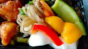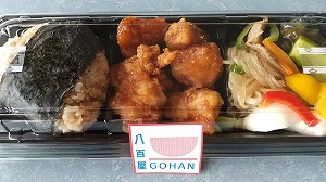 「虹のマート」内の「八百屋GOHAN」。八百屋さんの経営なので、お野菜盛りだくさんのお弁当。お昼時ともなると作業服姿のおじさまたちで込み合っています。きっと奥様から「お野菜もとってね!」といわれているのかなぁ~。とにかく売れています。この“日替わり弁当(450円)”は、鰹節おにぎり・鶏胸肉の甘辛揚げ・ピクルス・茄子炒め・チャプチェ。レンコンサラダ(200円)とサーモンのマリネ(300円)も買ってみました。味付けがちょうどいい!美味しいです!