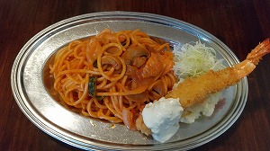 弘前市のSKKの向かいにある「洋食KAMIYA」。“オムライスとエビフライのセット(1550円)”をいただきました。お友達は“ナポリタンとエビフライのセット(1550円)”お友達は「チーズがかけたい~」と。私もナポリタンならチーズとタバスコが欲しいかも…。カケモノは卓上に一切ありません。コロナ対策?クリームブリュレと珈琲も付いています。常連さんが来る「街の洋食屋さん」という感じのお店でした。