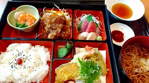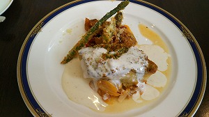 「ラプラス青い森」の週替わりランチ(1000円)です。お婆ちゃんは“海老天卵とじ+小鉢+キツネそば”。私は“メヌケ鯛の香草パン粉焼き”。お婆ちゃんは小鉢もサラダも残します。お年寄りは食が細いけど、少しづつ食べてみたいらしいので、そういうお年寄りメニューがあればいいのに…。もったいないね。マータイさんに怒られるよ(笑)