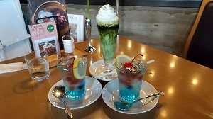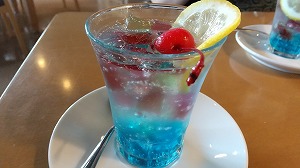 前川建築の弘前市民会館。初めて行きました。2階の喫茶室「baton」でティータイム。お友達は“青の時間のポンチ(660円)”を。これはこの弘前市民会館50周年の改装時に設置された、佐野ぬいさんのステンドグラス「青の時間」を記念したメニューということです。青の寒天がキラキラしてホントに綺麗。私はフローズン抹茶オレ(660円)をいただきました。ちょっと年寄りにはボリュームありすぎかな!美味しゅうございました!