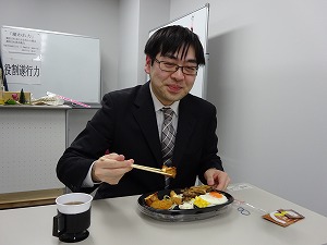 正社員のお仕事の紹介と打合せの為にアウルに来てもらったケンさん。打合せの後のランチでは、これからのお仕事の為にパワーをつけてもらいたく、HottoMottoのがっつり系お弁当“カットステーキコンボ”です。ボリューム満点ですね。