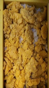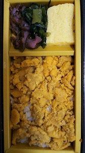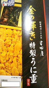 吉田屋の“金の輝き特製うに重”でございます。吉田屋さんは次から次へといろいろなものを出しなさる。アイデアマンがいるんだな。フタを開けても、そんなに輝いてはいませんが“蒸しうに”のお味がみっちり。味が染みているご飯でした!