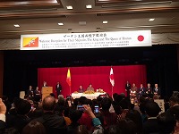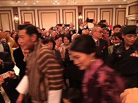 25日、ブータンのワンチュク国王夫妻の歓迎会が帝国ホテルにて催されました。私のお友達もJICAのお仕事でブータンに赴任していたこともあり参加。やめたほうがいいという私の忠告を聞かずに、国王に自分のレポートを手渡しました。やれやれ。ぶしつけですね。600人の出席者の中、日本在住のブータン人の多いこと。みんな民族衣装の“ゴ”を着ています。ブータンの方々にとっては国王陛下に会えるなんて末代までの誉れでしょう。ブレブレの写真がかえって雰囲気を出しています。(お料理はエマダツィ)
