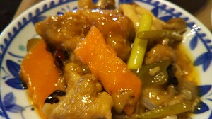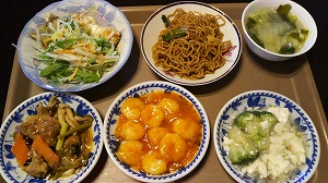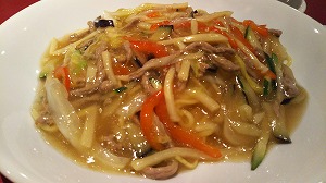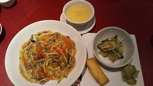 何だか超薄味の焼きそばです。国際ホテルの「吉慶」で、6月のレディースランチ(1296円)を頂きました。”五目あんかけ焼きそば”はとても美味しかった記憶がありますが、あれから数年。今日は”牛細切りと茄子のあんかけ焼きそば”なので、茄子から水気がでちゃったのかしら?薄味好みのお友達もお醤油を二回し。きっと、何かを入れ忘れたのね…塩?出汁?醤油?でも、味覚はひとそれぞれ。今度は定番の”五目あんかけ焼きそば”に挑戦!