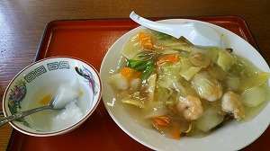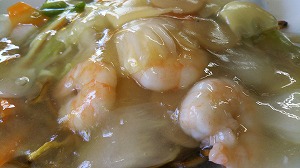 「重慶」は税務署通りの海寄りにあります。この前ユカリンが食べていた”エビあんかけヤキソバ(750円)”が美味しそうだったのでソレを。けっこう甘口。お酢を二回しするとワタクシ好みになりました。