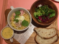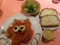 新宿にある”アリスの魔法の国”でランチです。チェシャ猫のニヤニヤスマイル♪チキンとトマトのスパゲッティセット1280円とカルボナーラスパゲッティプレート1200円。アリスの物語をコンセプトにしたお店で、店内のお客様のほとんどが女性。中にはアラ還世代のお姉さまたちが、ウサギの耳のカチューシャをつけて楽しそうに女子会を開いていました。女子なら世代は関係なく、一度は行ってみたい、”魔法の国”。実際に行ってみたら、アリス役?の女性が、普通すぎて一気に現実世界に引き戻されたユカリンでした。