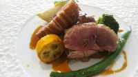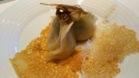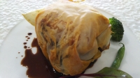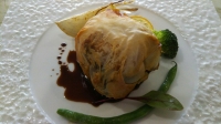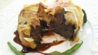 弘前の「シェモア」の”青森産牛ほほ肉のりんごパートフィロ包み焼き(2376円)”です。”パートフィロ”とはとうもろこし粉と小麦粉で作った薄皮のこと。焼くと、パイ生地に似たサクサク感が味わえます。真ん中からカットして…こんな感じ!美味しゅうございました!