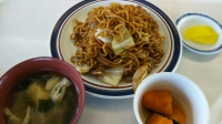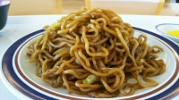 ご覧ください、この焼きそばの量!東奥日報社の社食の日替わり定食(530円)です。本当はこれにご飯がつきますが「ご飯無しで!」と頼むと、焼きそばが大盛りになります。コレ大切なポイントです!