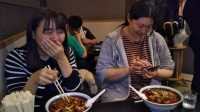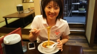 青森市で行列のできるラーメン店といえば栄町の「あさ利」。いつ行ってもお店の外まで並んでいます。お花見の時期には県外からのお客様で、長蛇の列。私たち青森っ子は閉店30分前に行って悠々とお座敷にあがります。今晩は東京っ娘のアァちゃんが初めて挑戦!こんな顔になってしまいました(笑)チャーシューは辛くて甘くて激ウマ!辛さは全員"3"(数字が小さくなるほど激辛になっていきます)。みんな汗だくで咳をしながら涙を流しながらの「何の拷問!?」「我慢大会かっ!?」といいながら食べ進めるも、2人が完食。あとの2人は半分もいかずに脱落…。激辛で激甘で時々無性に食べたくなる"あさ利"のネギラーメン。皆さんもレッツトライ!!