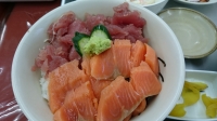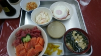 派遣スタッフのヒロチャンから投稿です。青森市卸町の中央卸売市場内の食堂で“二色丼(650円)”を食べたそうです。ここは市場で働く人たちの社食。朝の6時からやっています(一般の方もご利用可)。ゴロゴロとした鮪の中落ちと、このサーモンの分厚さ!3つの小鉢はヒロチャンが追加したんだって!とっても新鮮で美味しかったそうです。