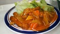 奥日報社の社食の“酢豚”は面白い!このお肉を見よ!拍子木切り!隣に並んでいたオジサンが「めったらだなっ!」と言って注文していました。「美味しそうだなっ!」という津軽弁です(笑)。